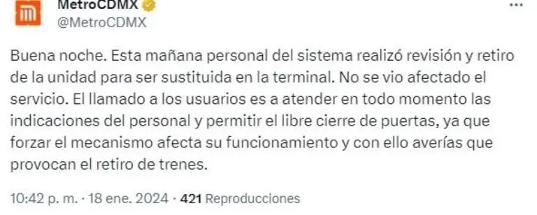 "Buena noche. Esta mañana personal del sistema realizó revisión y retiro de la unidad para ser sustituida en la terminal. No se vio afectado el servicio. El llamado a los usuarios es a atender en todo momento las indicaciones del personal y permitir el libre cierre de puertas, ya que forzar el mecanismo afecta su funcionamiento y con ello averías que provocan el retiro de trenes", sentenciaron.