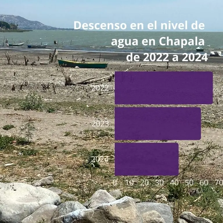 El Lago de Chapala se encuentra actualmente al 43% de su capacidad total, la cual es de 7,897 millones de metros cúbicos. Al estar en la orilla de la ribera, las cifras no son necesarias para percibir la crisis; la tierra está fracturada por el intenso sol primaveral, y el lodo pedregoso exhala un desagradable olor debido a los desechos que se han arrojado al agua durante décadas. La fauna se ha vuelto cada vez más escasa, y avistar garzas es ahora una cuestión de suerte, mientras que antes el sitio era conocido por la abundancia de estas aves.