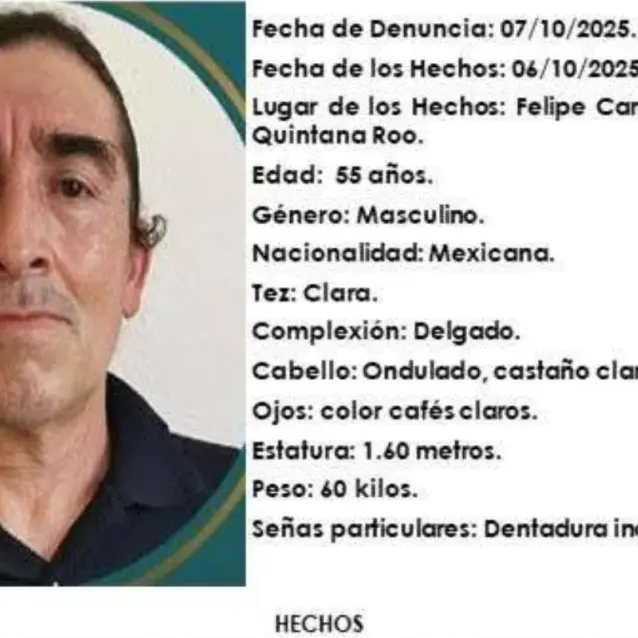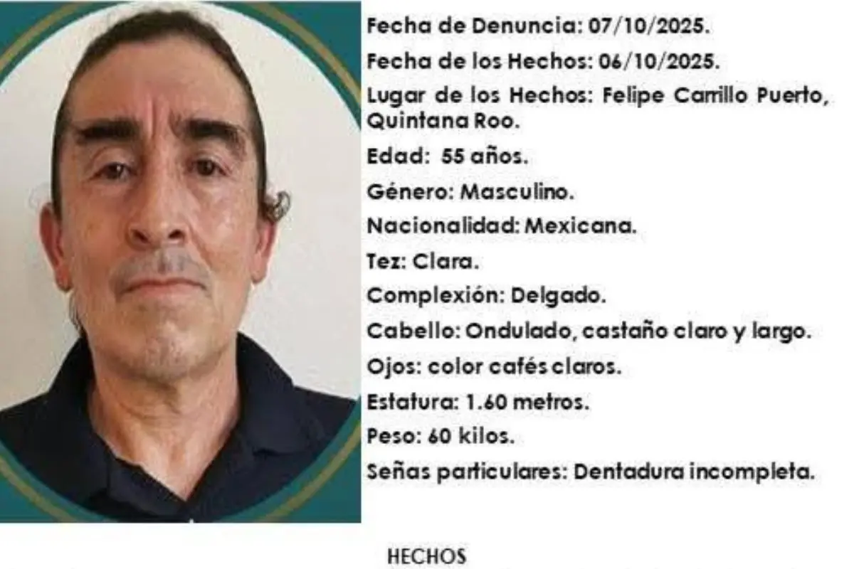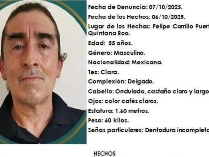 La Fiscalía de Quintana Roo activó una ficha de búsqueda para localizar al profesor de 55 años, visto por última vez el 6 de octubre.