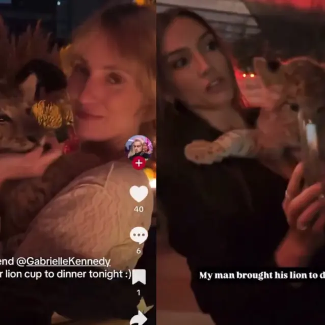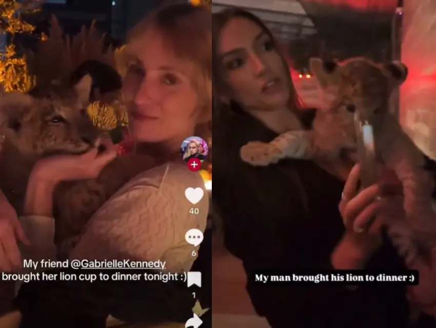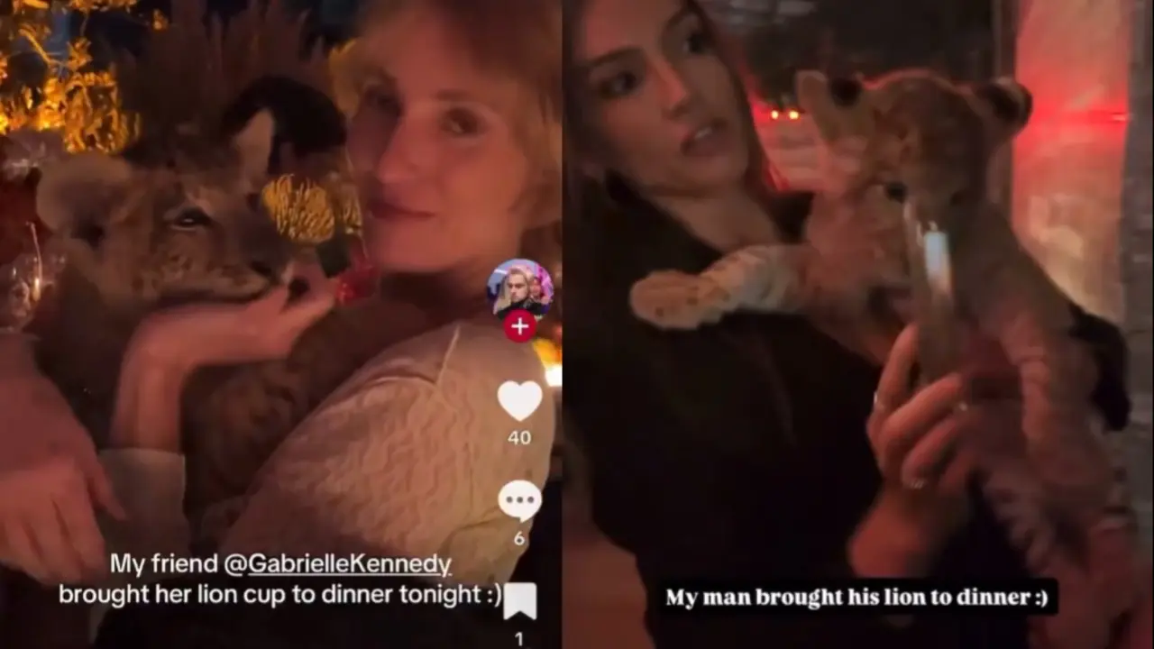 Según Scalioni, el cachorro de león pertenece a la comediante Gabrielle Kennedy, quien aparece en los videos jugando con el animal sobre sus piernas, metiendo las manos en su hocico y posando para fotografías mientras otros asistentes acarician al felino.