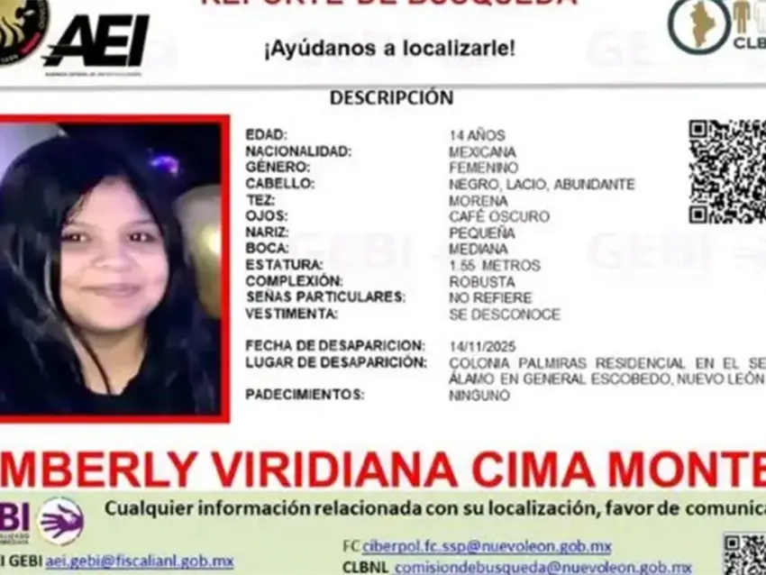 La desaparición de Kimberly Viridiana Cima Montes, de 14 años, mantiene en alerta a su familia desde el 14 de noviembre, cuando fue vista por última vez en Palmiras Residencial, sector Álamo, en el municipio de Escobedo, Nuevo León. Desde entonces, no existe ningún rastro de su ubicación y su caso se ha difundido en redes sociales para pedir apoyo a la ciudadanía.