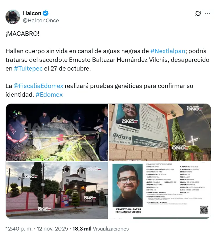 El 31 de octubre de 2025, la Diócesis de Cuautitlán informó que el sacerdote Ernesto Baltazar estaba desaparecido, lo que generó preocupación entre feligreses y autoridades. La ficha de búsqueda señalaba que su familia lo había visto por última vez el 27 de octubre en Tultepec. Con esa información, la Fiscalía estatal activó los protocolos correspondientes.