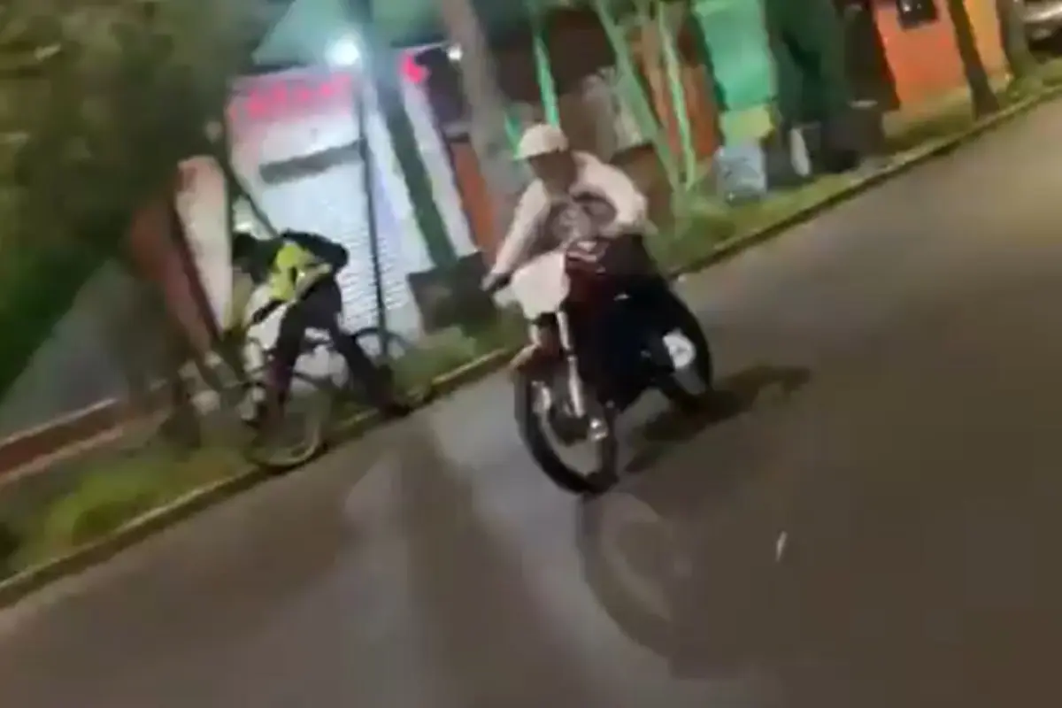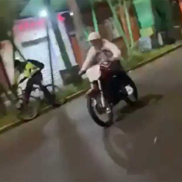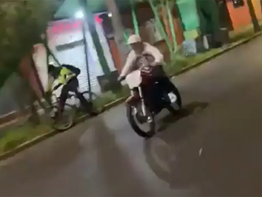 El clip, grabado desde otra motocicleta, muestra el momento en que un joven avanza en bicicleta por calles de la colonia Aviación Civil. De un segundo a otro, el motociclista acelera, se coloca a su lado, lanza una patada directa a la rueda trasera y escapa riendo mientras el ciclista pierde el equilibrio y se estrella contra la estructura metálica de un puente peatonal.