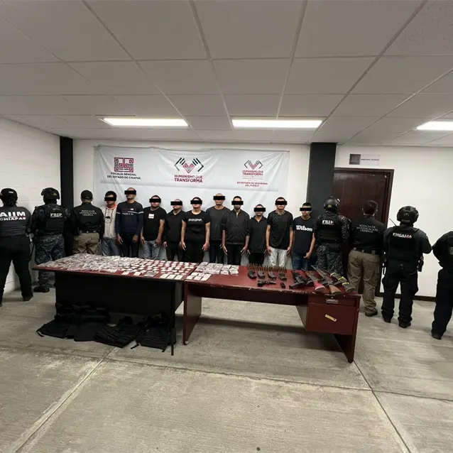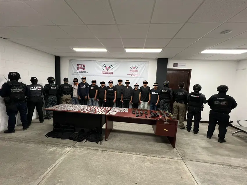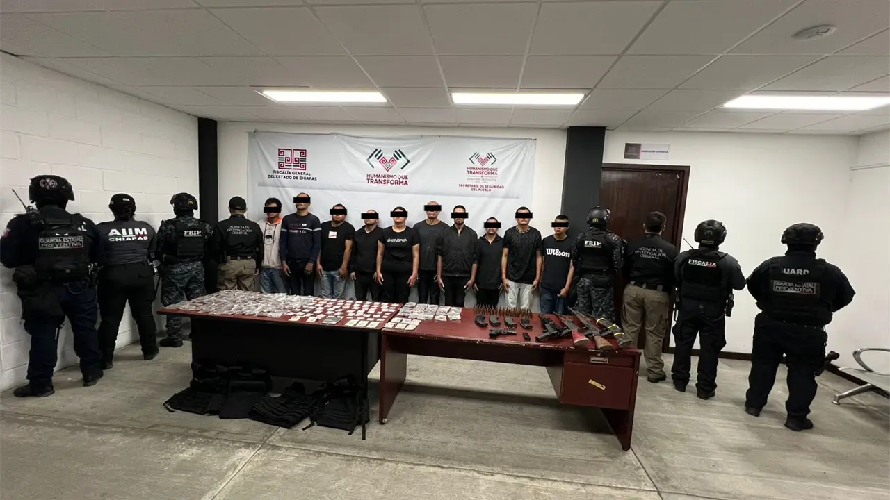 La Secretaría de Seguridad del Pueblo de Chiapas precisó que el operativo fue realizado por presuntos delitos contra la salud y violación a la Ley Federal de Armas. Los detenidos fueron identificados como Genaro "N", Juan Miguel "N", Sergio "N", Francisco "N", José G "N", José A "N", Luis "N", Ángel "N", Yoselin "N", Darwin "N", Emanuel "N" y Diego "N".