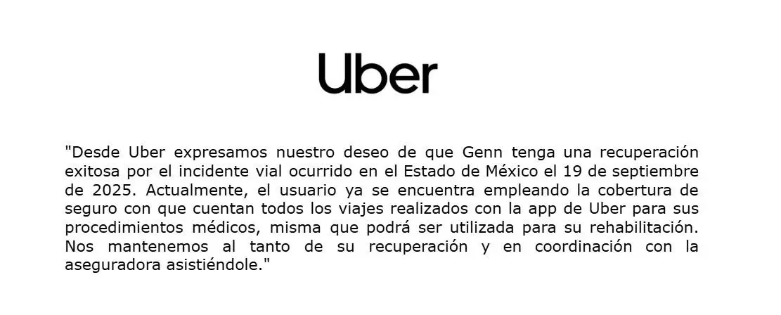 Uber aseguró que Genn está empleando la cobertura de seguro con la que cuentan los viajes realizados a través de la plataforma, y que la empresa se mantiene al tanto de su recuperación y en contacto con la aseguradora correspondiente.