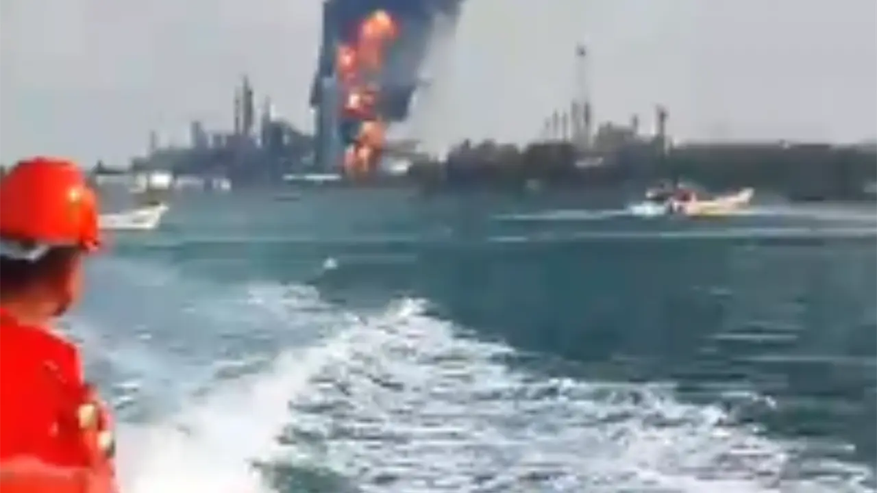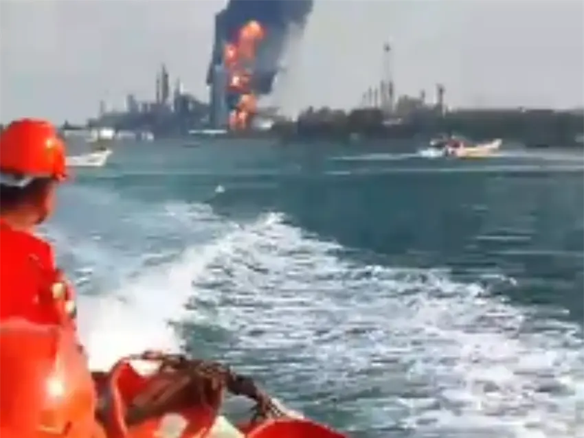 En el video se observa a varias personas con casco en una embarcación pequeña alejándose de la zona donde se produce el fuerte incendio que se ve tras ellos.