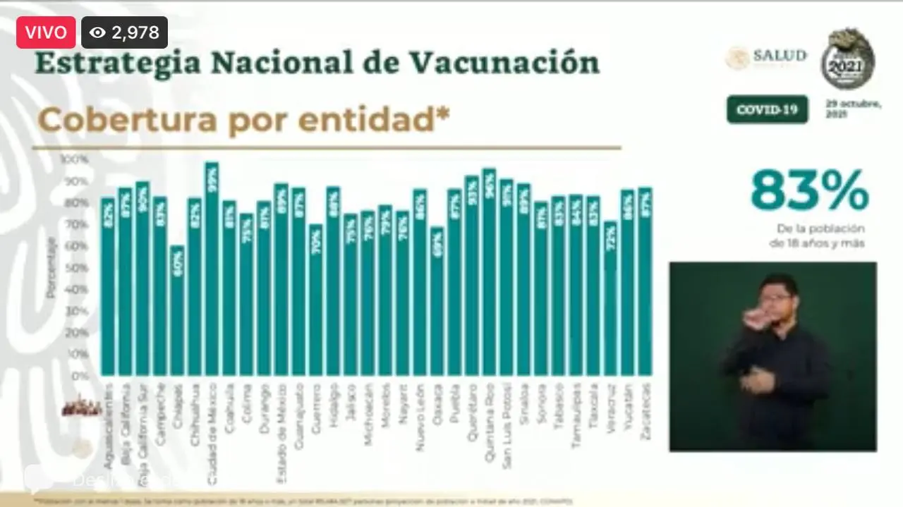 El subsecretario de Salud, Hugo López Gatell, informó que el 83 por ciento de los mexicanos mayores de 18 años se han vacunado.