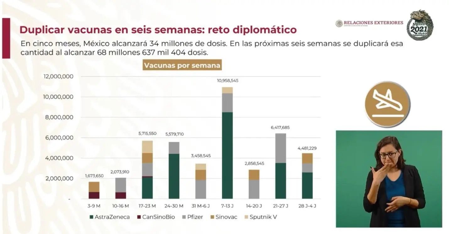 Por su parte, el canciller Marcelo Ebrard señaló que del 2 de mayo al 4 de julio, es decir mes y medio, México recibirá 34 millones de dosis, las mismas que se obtuvieron en los primeros cinco meses.