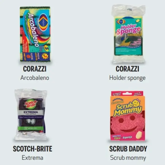 Chedraui Esponja grande, Corazzi Arcobaleno, Corazzi Holder Sponge, Ke Precio Fibra esponja, Reynera Value Pack, Scotch-Brite Extrema, Scrub Daddy–Scrub Mommy y Vileda Ultra Fresh Salvauñas.