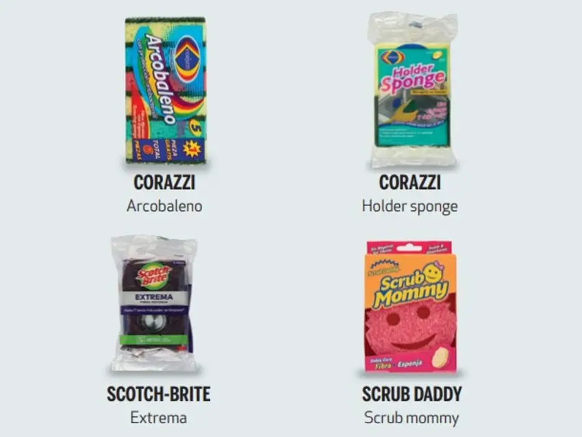 All Day House Fibra esponja multiusos, Chedraui Esponja multiusos, Fibrotón Fibra esponja multiusos, Fregón Scrubbing Sponge, Precíssimo Fibra esponja multiusos y Scotch-Brite Esponja recubierta.