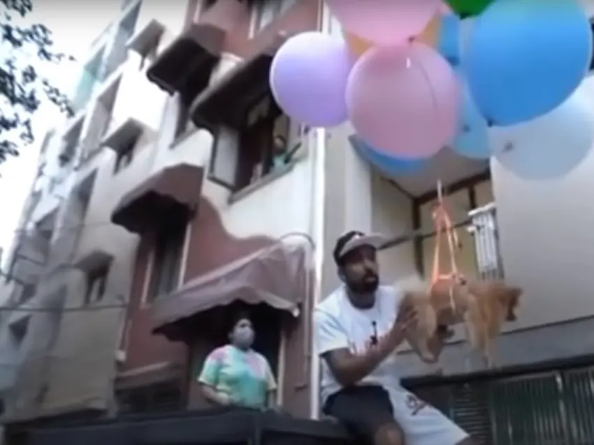 Luego tira un poco de la cuerda para que el animal se levante del suelo y cómo no se eleva a la altura que el joven desea, le ata más globos de hidrógeno hasta que el perro termina haciendo acrobacias involuntarias y llega al balcón segundo piso de un edificio donde es recibido por otra persona.