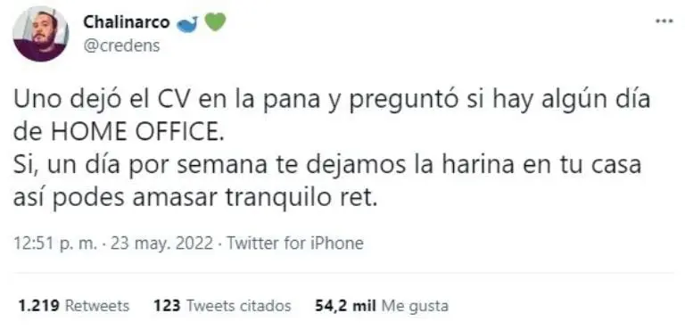 "Uno dejó el CV en la pana y preguntó si hay algún día de HOME OFFICE. Sí, un día por semana te dejamos la harina en tu casa así podés amasar tranquilo ret", escribió el dueño de la panadería.