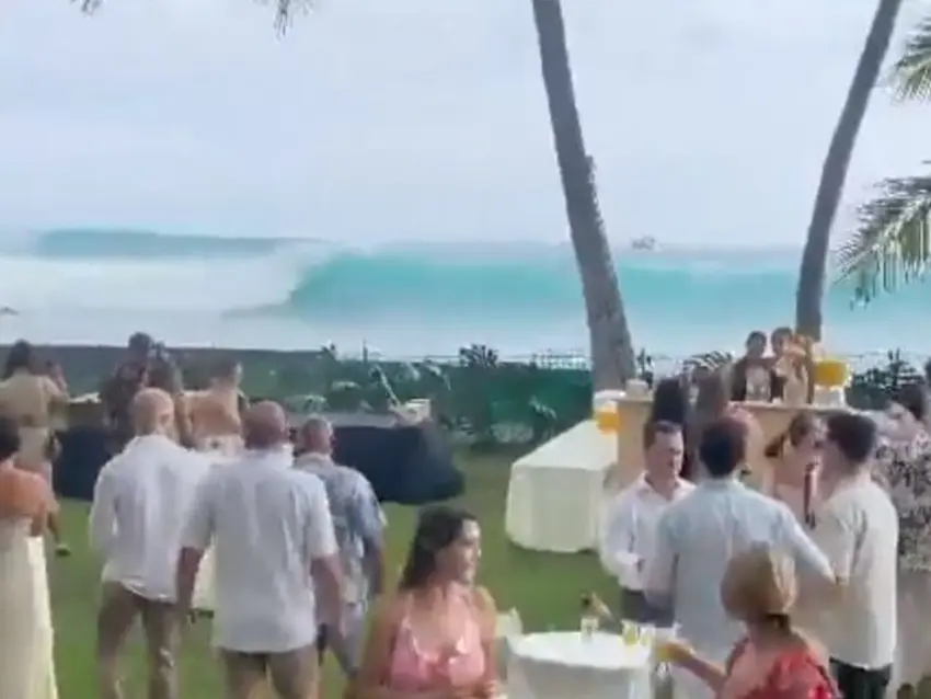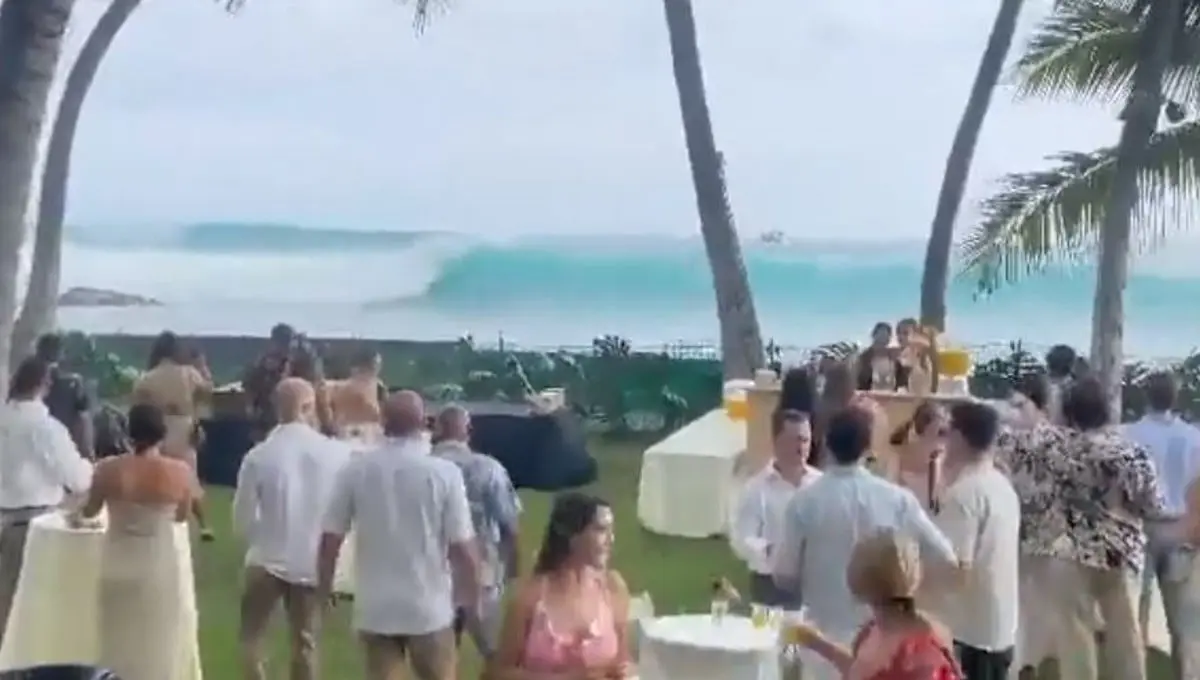En redes sociales circula el momento en el que los invitados a una boda observan cómo las olas se acercaban poco a poco hasta donde ellos estaban en la ceremonia religiosa. Una barda separaba a los invitados del mar, pero de pronto, el muro se vio rebasado por las olas.