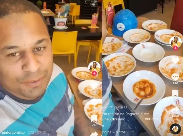 El nombre, oriundo de la ciudad de Sao Paulo, tiene por nombre Joao Carlos Apolonio, y se dedica a la construcción y pintura de casas, razón por la cual, él asegura que necesita mucha energía El hombre accedió a la oferta de pagar 19.90 reales (80 pesos) para comer todo lo que se le antojase. El hombre entonces pedido 15 platos de pasta, ante lo cual los dueños del lugar le dijeron que si no se los comía todos debía pagar una multa de 9.90 reales (40 pesos).