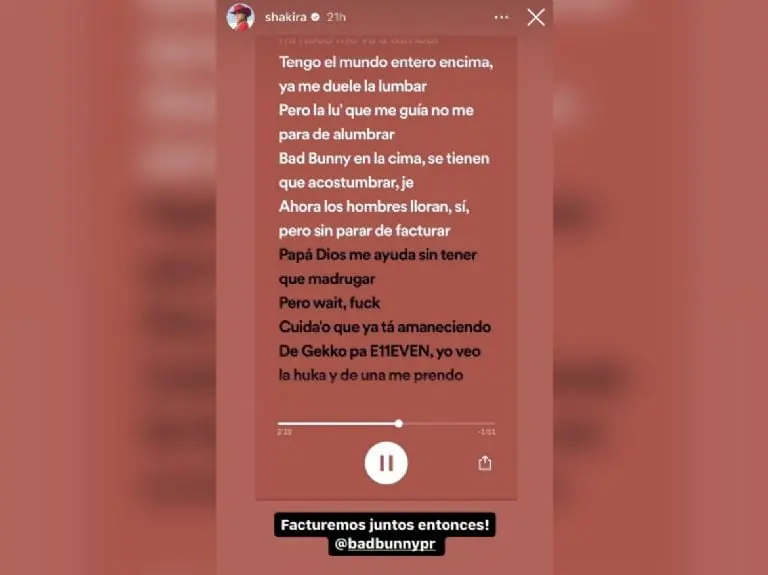 La reacción de Shakira no se hizo esperar. El martes 17 de octubre, la intérprete de "Antología" recurrió a su cuenta de Instagram para responder a Bad Bunny. En su publicación, Shakira compartió la letra de la canción de Benito que hacía referencia a su famoso lema. La artista colombiana, lejos de entrar en una polémica, respondió con un tono amigable: "¡Facturemos juntos entonces!".