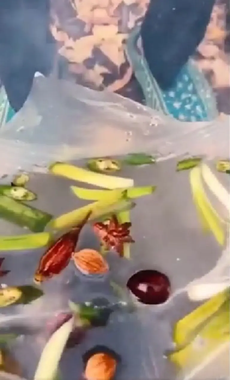 Al aire libre, esta creativa abuelita hace uso de una rama gruesa para suspender la bolsa de plástico llena de agua sobre el fuego. En algunos videos, se observa cómo hierve verduras y especias, mientras que en otros, emplea la misma técnica para cocinar pescado y carne de res.