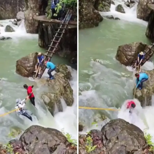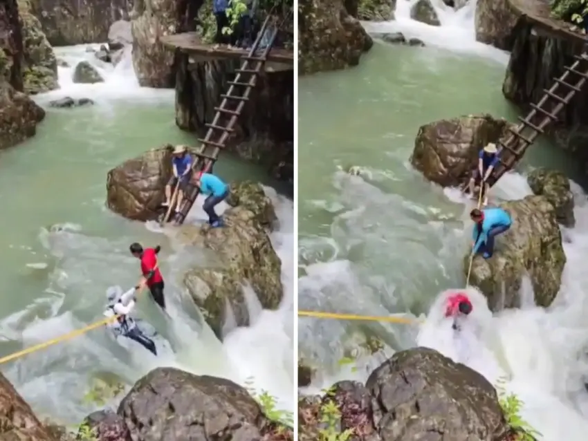 El video que ha sido compartido en X, antes Twitter, acumula casi un millón de reproducciones. En él se ve cómo un hombre, quien viste una playera roja, y su acompañante, una mujer que porta una blusa blanca, intentan cruzar la cascada con la ayuda de una cuerda y mientras porta una especie de arnés.