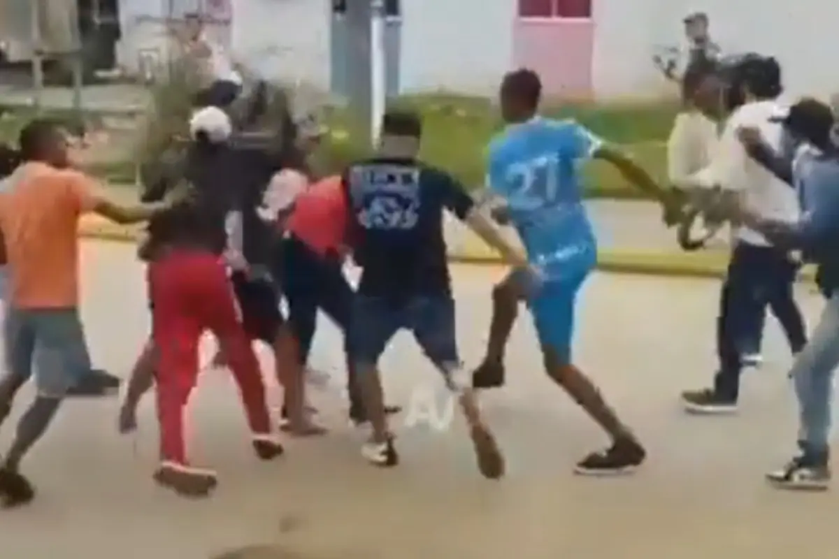 Lejos de calmarse, la pareja siguió discutiendo mientras el hombre intentaba levantar su motocicleta del suelo. En ese momento, otro joven apareció en escena y le lanzó una patada voladora que dio inicio a la golpiza. De inmediato varios hombres se unieron y comenzaron a golpearlo durante varios segundos, sumando incluso otra patada aérea antes de que el agresor pudiera reincorporarse.