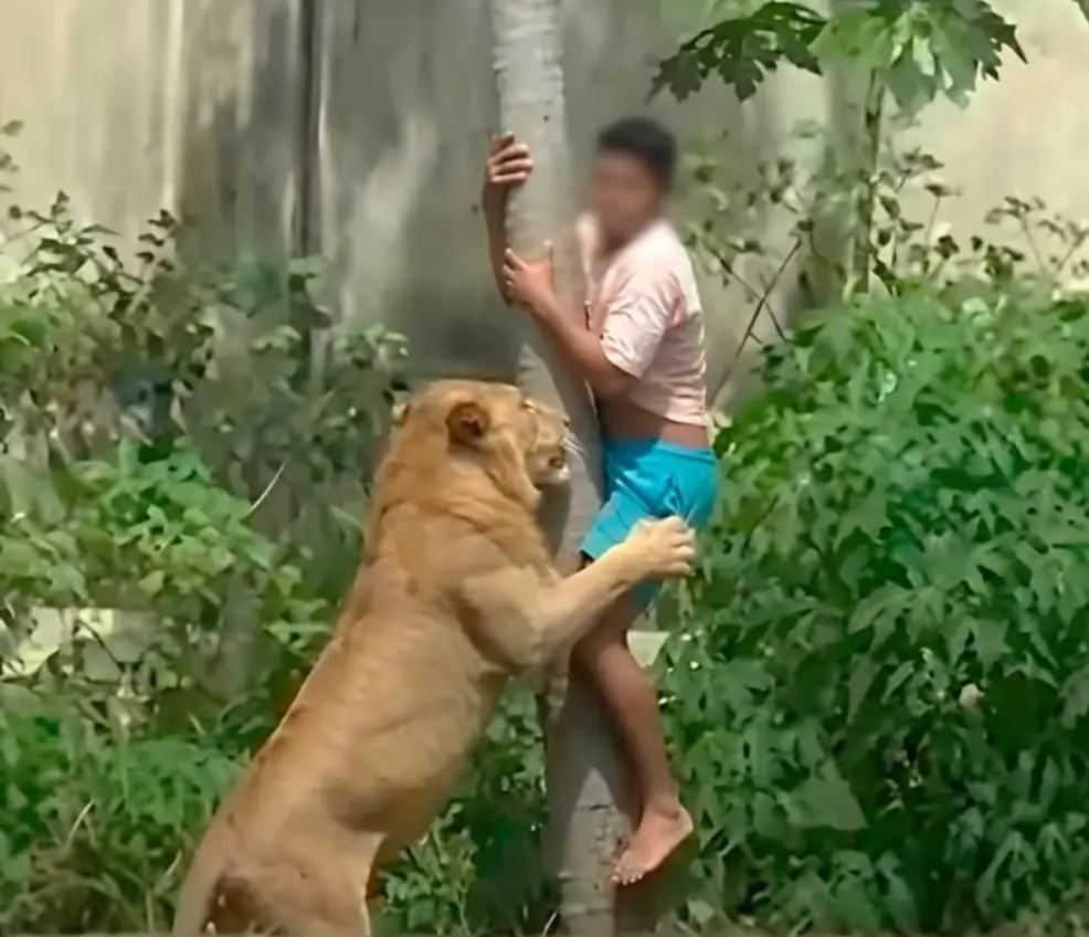 El clip viral muestra el momento en que la leona, que descansaba cerca de un vidrio panorámico, gira la cabeza al escuchar el movimiento en el árbol. En cuanto identifica al intruso, se incorpora de inmediato y corre hacia él. La grabación captura el instante exacto en que la leona trepa parte del tronco, alcanza las piernas del joven y lo sujeta con fuerza.