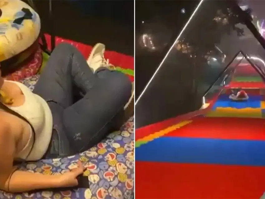 En la parte final del trayecto, al tomar una curva, la mujer impacta contra el plástico de la estructura, rompe una sección del tobogán y sale proyectada al vacío desde varios metros de altura.