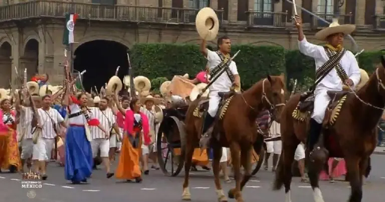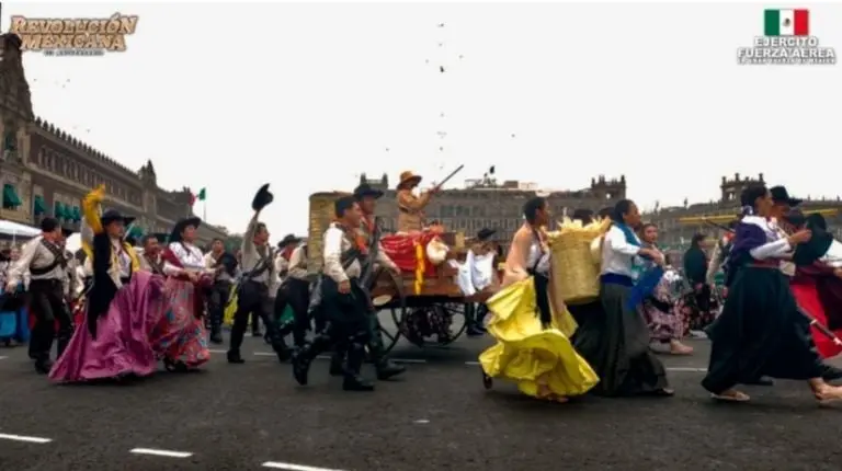 Los elementos más llamativos fueron una locomotora que pasó por la Plaza de la Constitución, con Adelitas y revolucionarios abordo, así como los cañones de guerra, los caballos y vehículos militares.