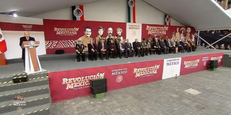 En la mesa de honor junto al mandatario también estaban los secretarios de la Defensa, Luis Cresencio Sandoval, de la Marina, Rafael Ojeda, el de Gobernación, Adán Augusto López, el de Economía, Rogelio Ramírez de la O y la secretaria de Seguridad y Protección Ciudadana, Rosa Icela Rodríguez y los presidentes de las Mesas Directivas en las Cámaras de Senadores y Diputados, Armando Armenta Mier y Santaigo Creel.