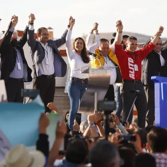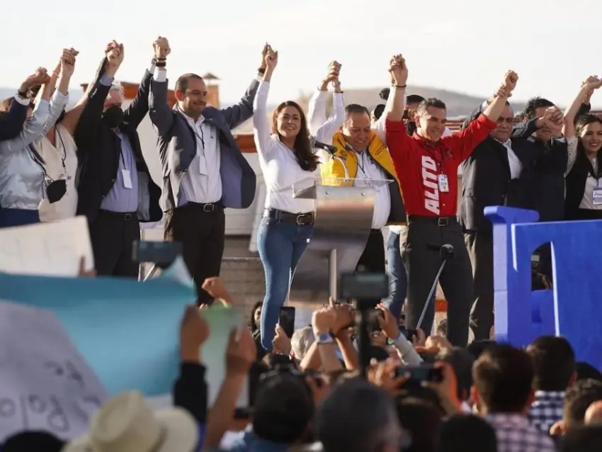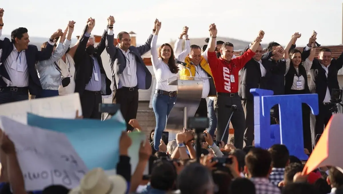 Durante un mitin, Teresa Jiménez estuvo acompañada de los dirigentes nacionales del Partido Acción Nacional (PAN), Marko Cortés; del Partido Revolucionario Institucional (PRI), Alejando Moreno, y del Partido de la Revolución Democrática (PRD), Jesús Zambrano.