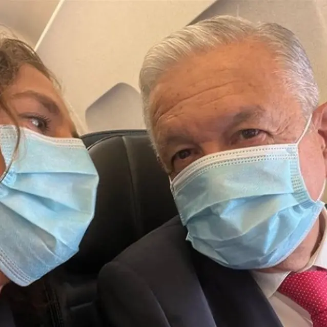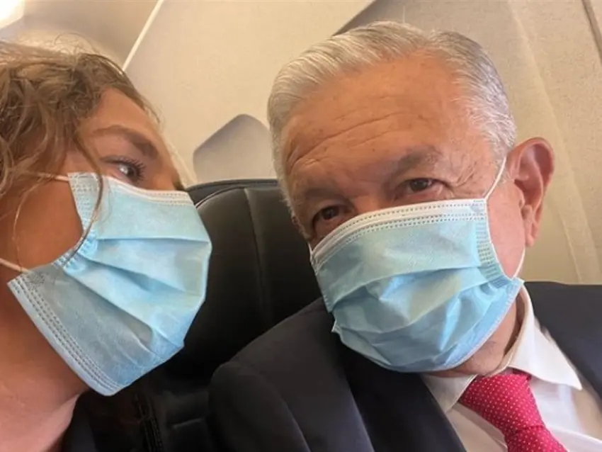 López Obrador está acompañado por su esposa Beatriz Gutiérrez Müller; el secretario de Relaciones Exteriores, Marcelo Ebrard, y la secretaria de Economía, Tatiana Clouthier