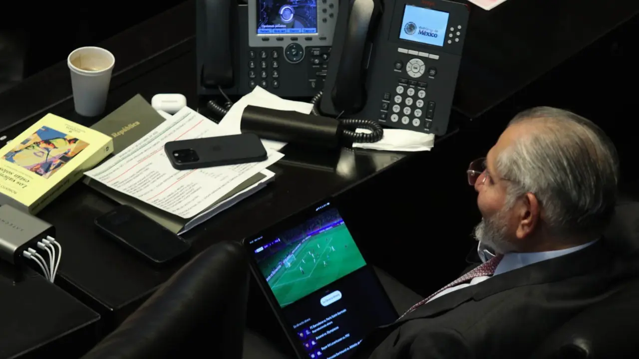 El coordinador de Morena utilizaba audífonos inalámbricos y seguía las jugadas en su tableta electrónica, mientras en el pleno se discutían temas relacionados con el déficit fiscal y el apoyo financiero a Petróleos Mexicanos (Pemex). Además, tenía su teléfono móvil en la mano y otro dispositivo colocado boca abajo sobre su escaño.