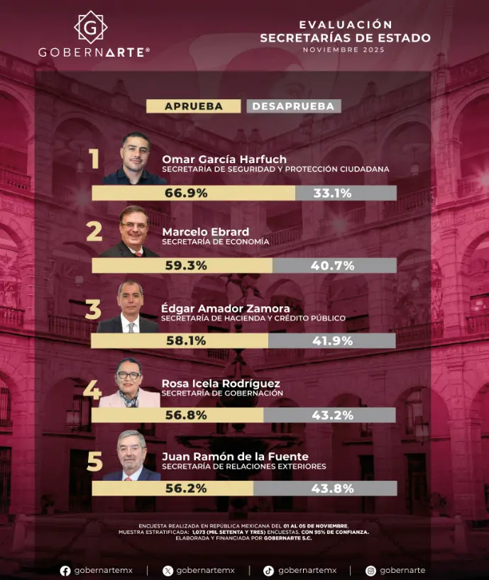 El secretario de Seguridad Pública, Omar García Harfuch, se ha consolidado como el funcionario mejor evaluado del gabinete federal, según la más reciente encuesta realizada por Gobernarte entre el 1 y el 5 de noviembre de 2025.