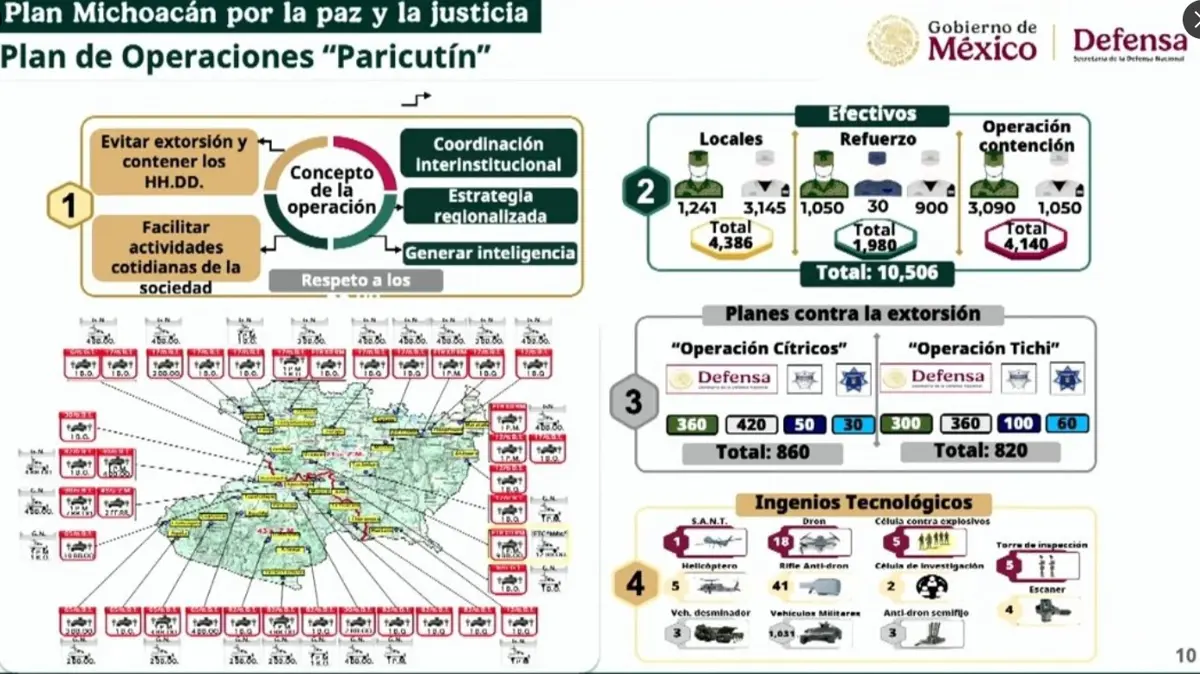 El general Ricardo Trevilla Trejo, titular de la Secretaría de la Defensa Nacional, presentó la Operación Paricutín, enfocada en contener la violencia, combatir la extorsión y frenar el tráfico de drogas en la región.