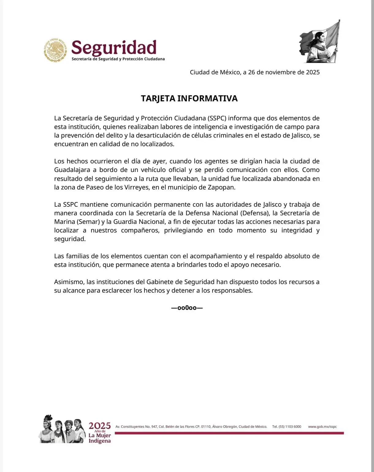 Al confirmarse la no localización de los agentes, la SSPC informó que mantiene comunicación directa y permanente con las autoridades estatales para coordinar los trabajos de búsqueda. En el operativo participan también la Secretaría de la Defensa Nacional (Sedena), la Secretaría de Marina (Semar) y la Guardia Nacional, que desplegaron equipos especializados para recorrer distintos puntos del Área Metropolitana de Guadalajara.