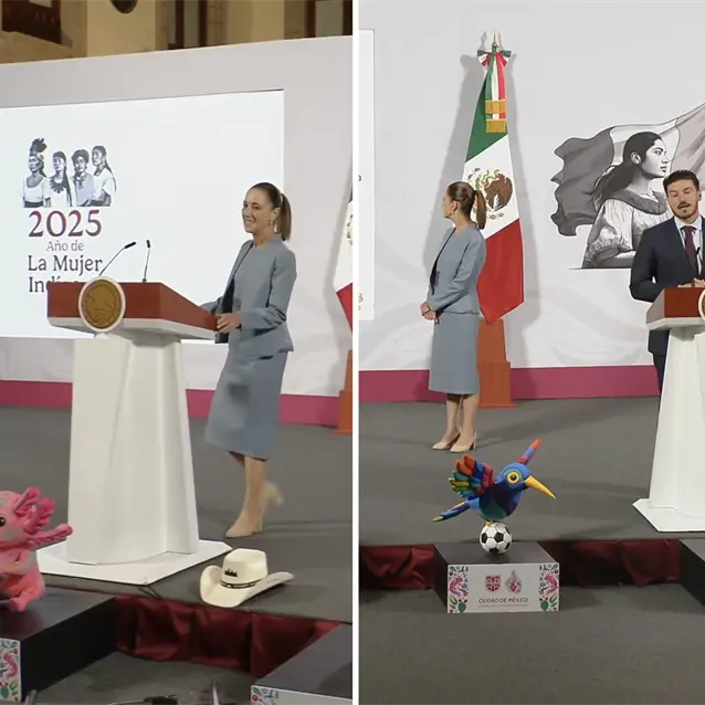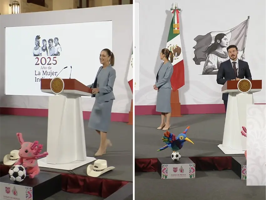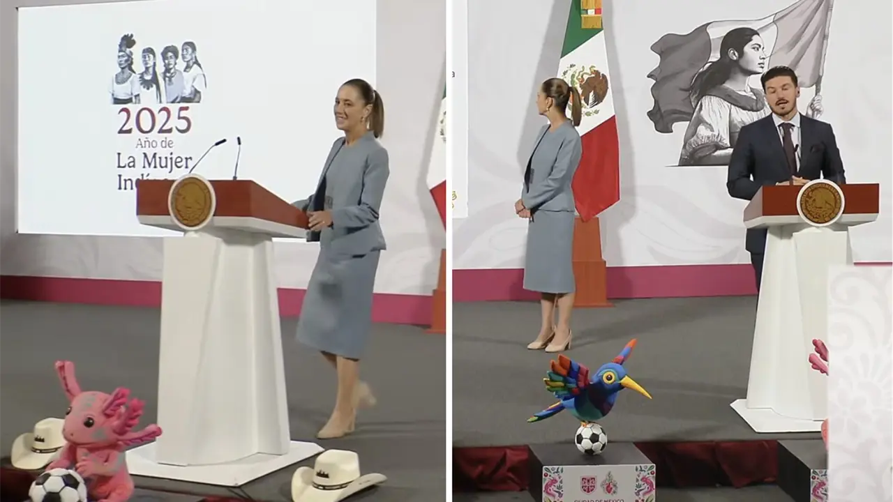 Una escena inusual se vivió este 27 de noviembre en el Salón Tesorería de Palacio Nacional, durante la conferencia matutina en donde se habló del Mundial de Futbol de 2026. En el escenario, además de peluches alusivos a las mascotas, se colocaron varios sombreros norteños, supuestamente aportados por parte del equipo del gobernador de Nuevo León, como parte de la escenografía alusiva a Monterrey.