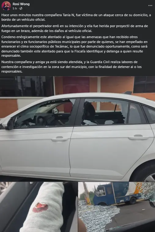 Al inicio de la administración, Tania Avendaño se desempeñó como directora de Ecología y Administración del Medio Ambiente antes de asumir su cargo actual en Bienestar Social del DIF municipal. Imágenes difundidas por la alcaldesa muestran el vehículo blanco con los vidrios rotos y la herida en el brazo de la funcionaria.