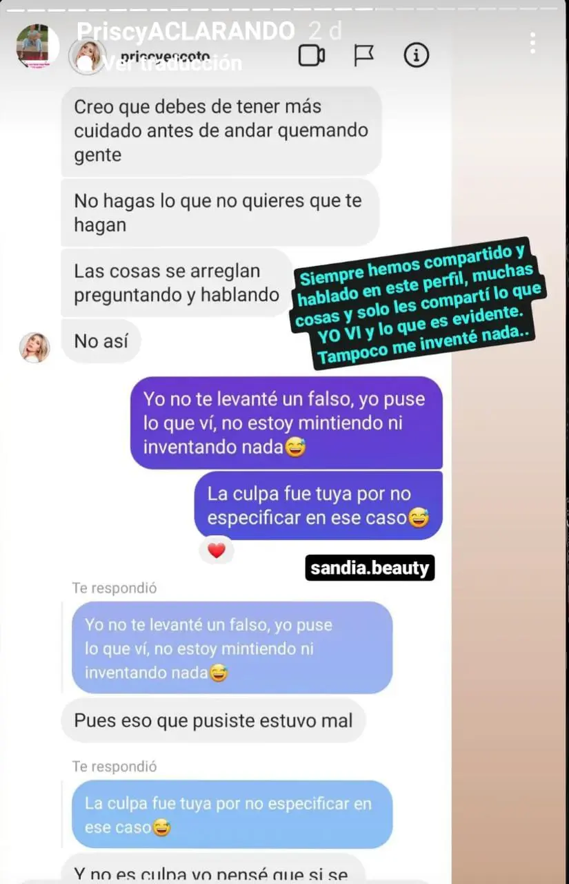 "Creo que debes tener más cuidado antes de andar quemando gente. No hagas lo que no quieres que te hagan. Las cosas se arreglan preguntando y hablando", se lee en el mensaje que le envió Priscy Escoto.
