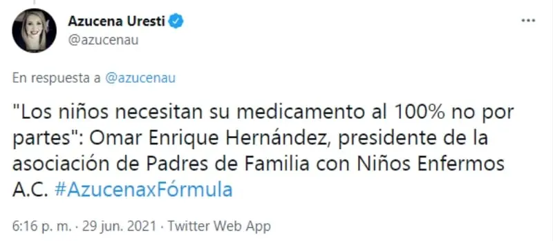 Por su parte, Omar Enrique Hernández, presidente de la Asociación de Padres de Familia con Niños Enfermos A. C., declaró que los niños con cáncer requieren su medicamento de forma constante y "no en partes", esto durante una entrevista con Azucena Uresti, periodista de Grupo Milenio.