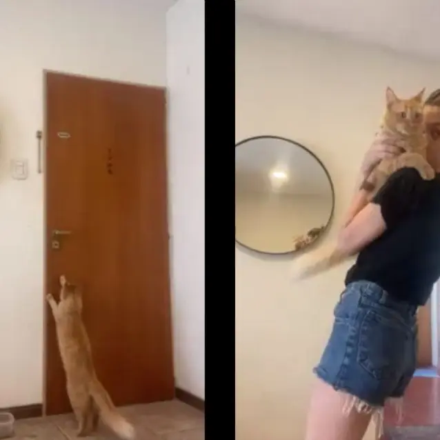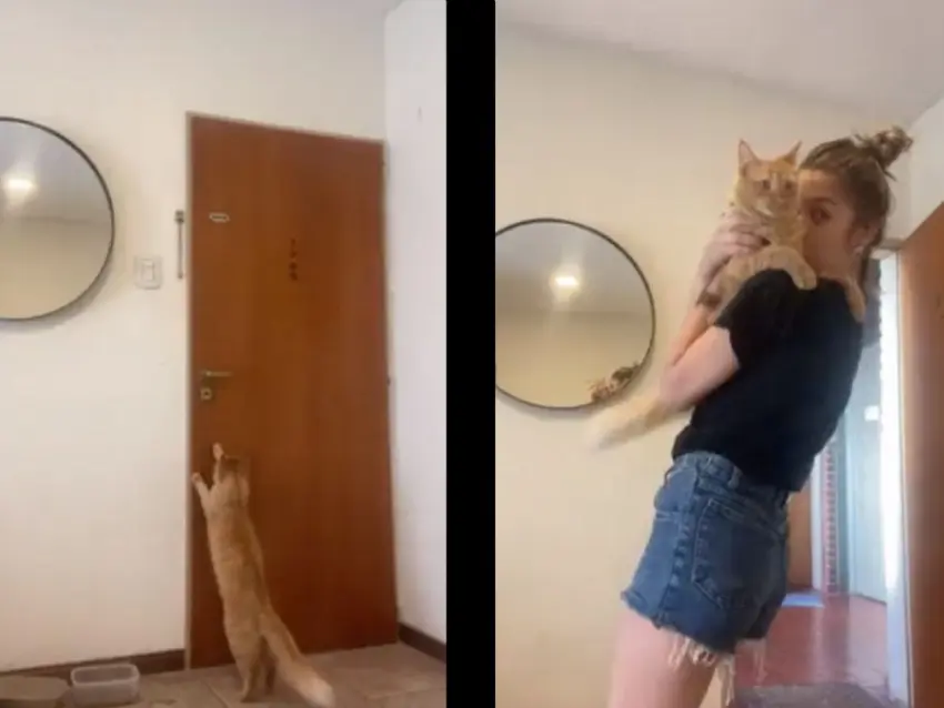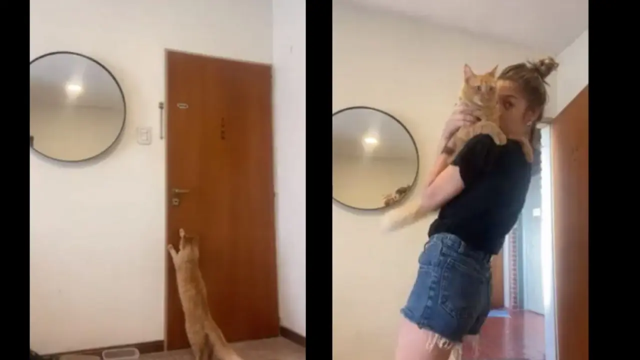 En el segundo video, grabado desde adentro, se puede ver al gatito esperando pacientemente frente a la puerta. Al sentir la presencia de la mujer, comienza a maullar y en un segundo brinca para abrir la puerta del departamento.