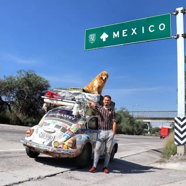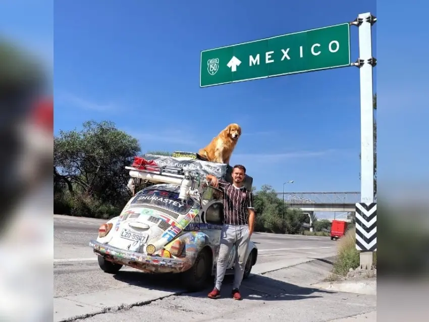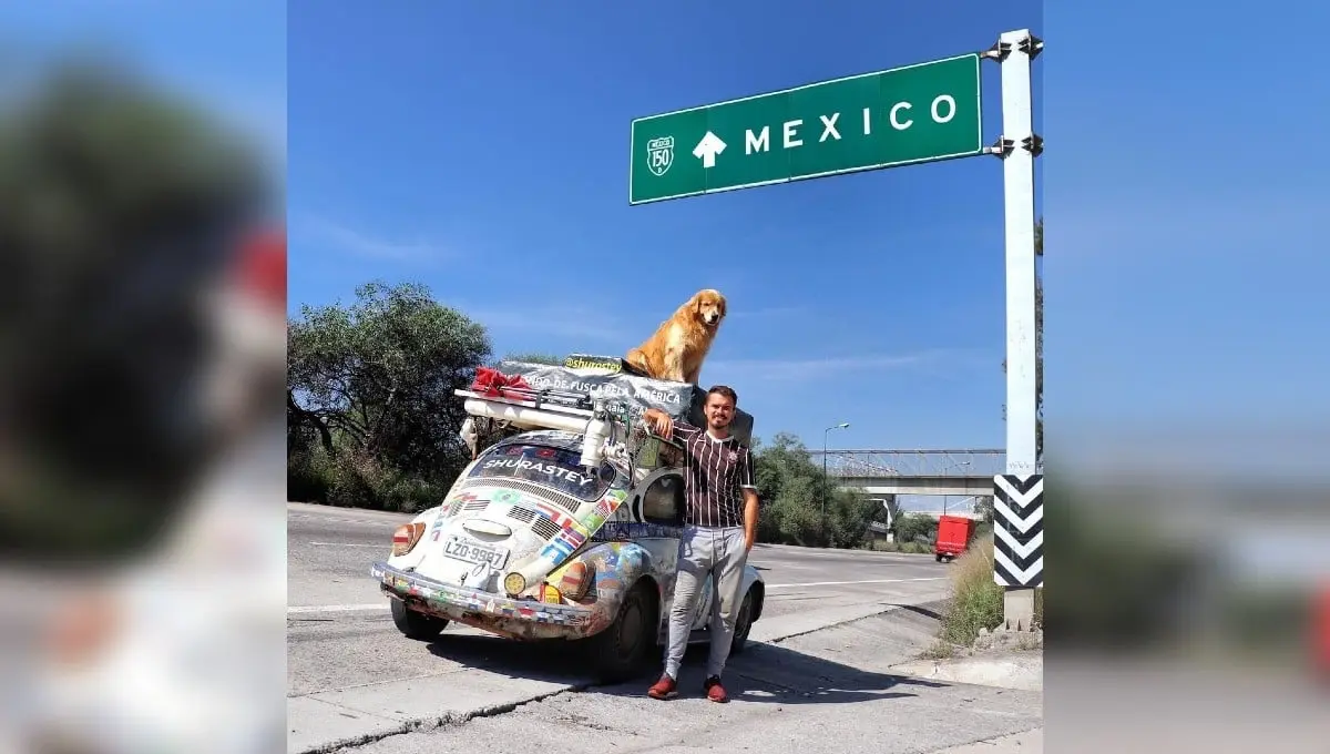 Jesse Koz y Shurastey iniciaron el viaje en 2017 cuando salieron de Brasil y atravesaron 16 países hasta llegar a México a bordo de su vocho color blanco en el que pusieron las banderas de los países que visitaron.
