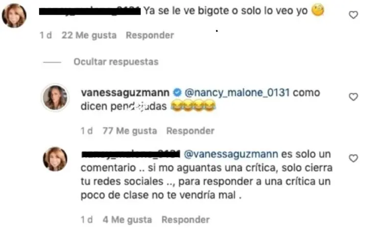 Recientemente una usuaria de Instagram llamada Nancy le escribió en un video: "Ya se le ve bigote o solo lo veo yo", comentario que molestó a Vanessa Guzmán y le respondió: "Como dicen pende#*das" con caritas de risas, algo que algunos seguidores consideraron que fue grosero.