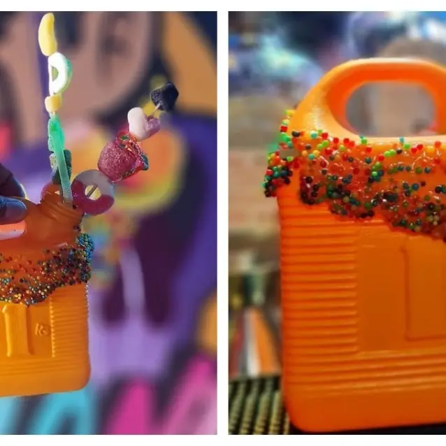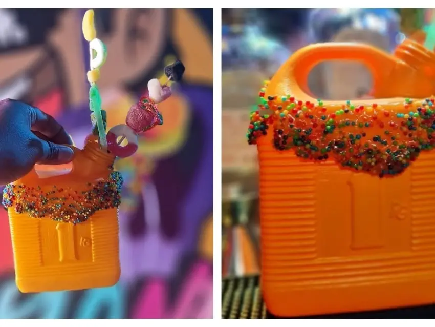 De acuerdo con el menú que tienen en su página de Facebook, los clientes pueden armar su propia bebida. El primer paso es elegir un envase que puede ser el bidón de gasolina u otro de los que tienen. Después deben seleccionar un sabor (mora azul, fresa, mango, yakult, entre otros) que son jugos sin alcohol que ellos crearon.