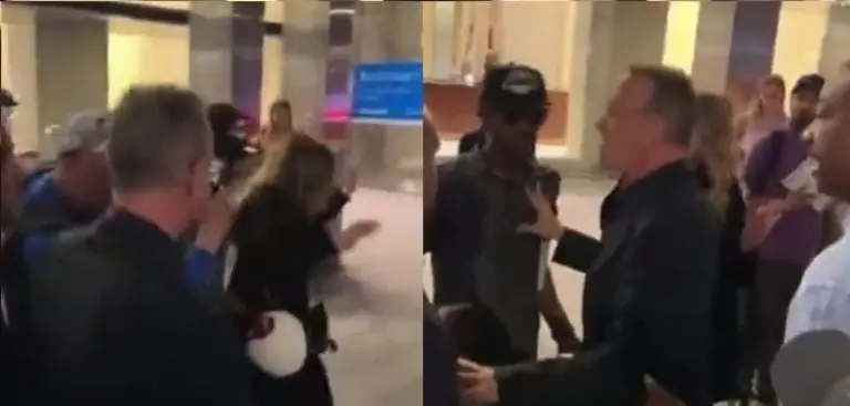 Aunque Rita logró conservar el equilibrio, Hanks se da cuenta de inmediato del incidente y en el acto detiene la escena y pone su mano en el pecho del hombre que casi tira a su esposa para gritarle con furia: