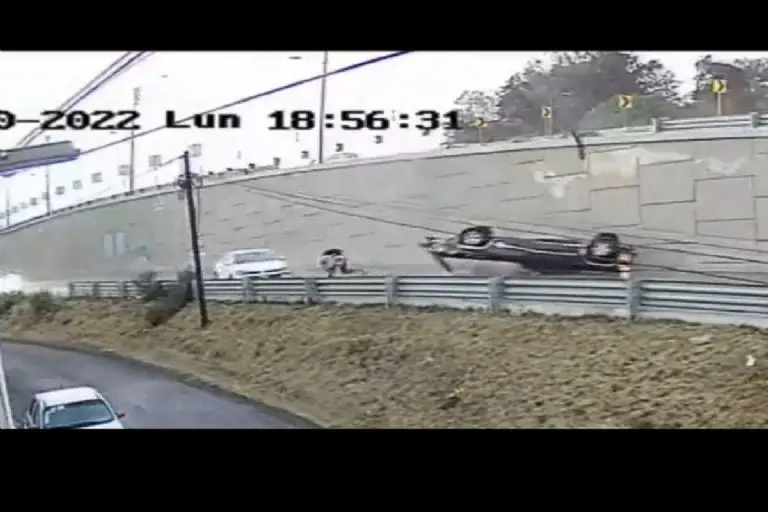 El hombre también se salvó de ser atropellado pues un auto que avanzaba a toda velocidad por la lateral estuvo a punto de arrollarlo cuando él entró al carril para evitar ser aplastado. Sin embargo, el auto consigue esquivar, tanto al individuo como al auto que cae del puente.