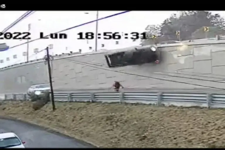 En el video se puede apreciar el momento en el que el hombre camina por debajo del puente cuando, sin previo aviso, cae el automóvil a lo que el reacciona de manera inmediata y brinca la valla de contención para salvar su vida.