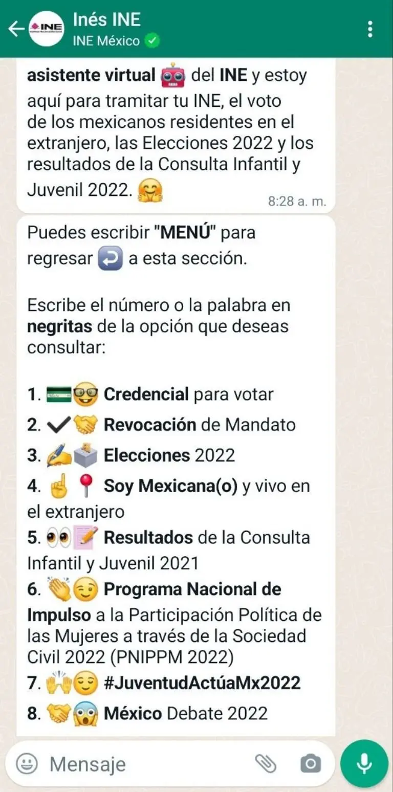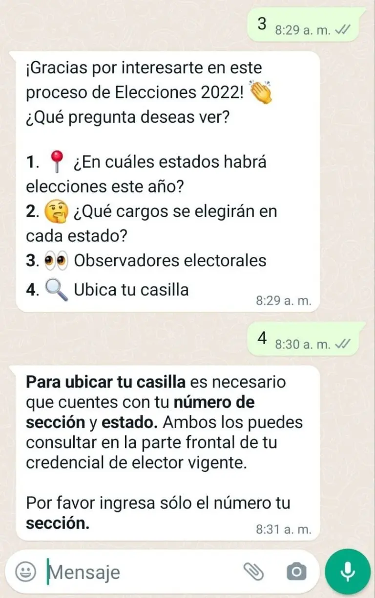 - Se desplegará un menú con ocho opciones. Escribe el número "3" que corresponde a "elecciones 2022". Te enviarán un nuevo menú donde debes escribir el número "4" que corresponde a "ubica tu casilla".