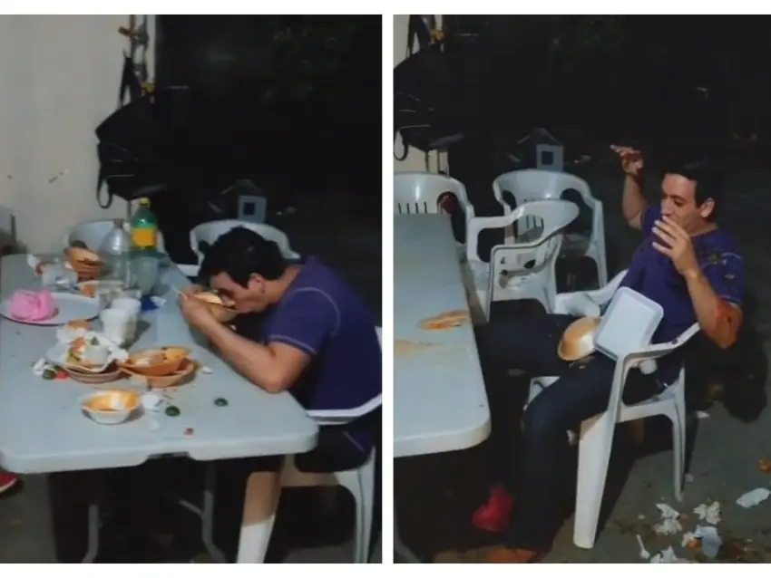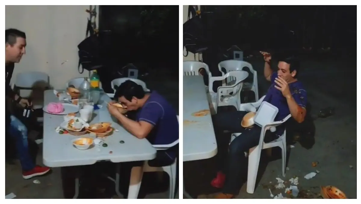 Sin embargo, el usuario @rigo_tuba_grupoc decidió realizar el reto viral justo cuando uno de sus amigos se encontraba comiendo. En el video que compartió se observa que primero se levantó a bailar y luego volteó la mesa con las manos, ocasionando que los platos se cayeran al piso.