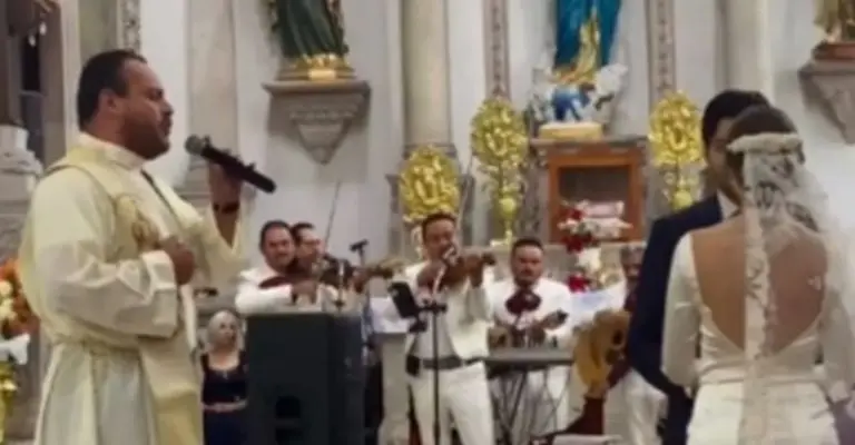 En el clip de apenas un minuto, titulado ´Se rifo el padrecito´ se puede observar al sacerdote enfrente de los novios entonar la pista de regional mexicano, en compañía de un mariachi.