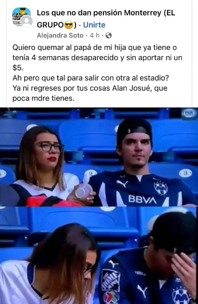 "Quiero quemar al papá de mi hija que ya tiene o tenía 4 semanas desaparecido y sin aportar ni un $5. Ah pero, ¿qué tal para salir con otra al estadio? Ya ni regreses por tus cosas Alan Josué, que poca madre tienes", escribió Alejandra Soto.