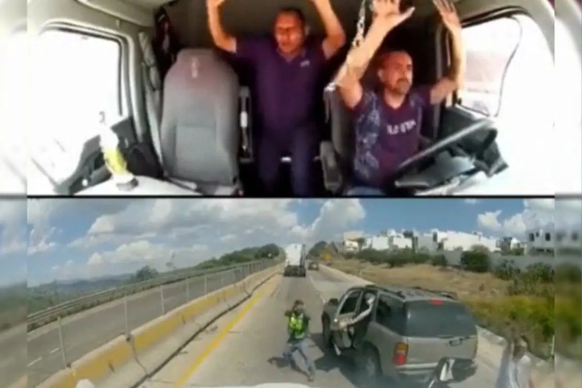 Cámaras de seguridad de un tráiler captaron el momento exacto en el que un grupo sujetos armados, detuvieron al conductor del vehículo para obligarlo a bajarse de la unidad y apropiarse del transporte en la autopista Querétaro-Irapuato, a la altura de la caseta de Chichimequillas.