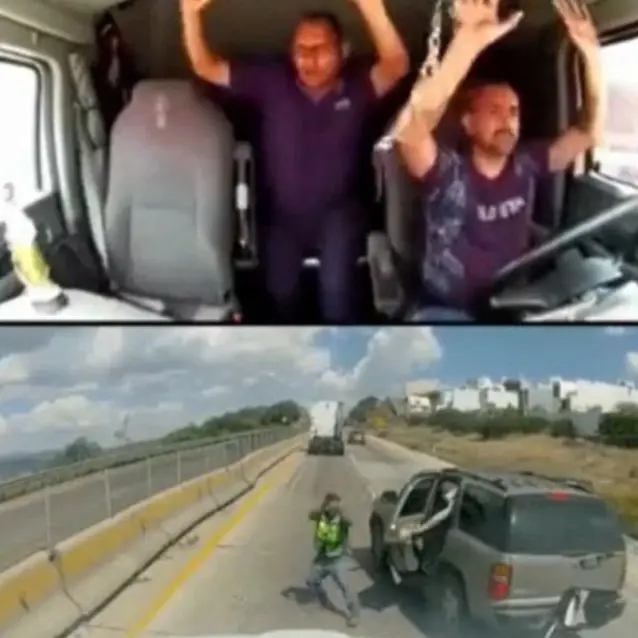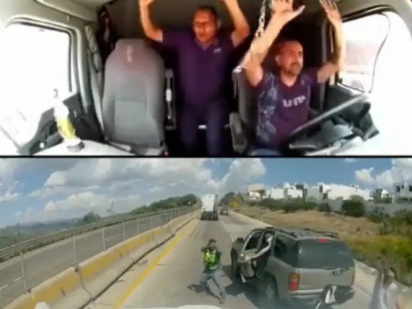 Asimismo, también se observa la cámara interior del tráiler, en donde se ve al conductor alzar las manos mientras es amenazado con una pistola; por su parte, su compañero lanza su celular a la parte trasera para esconderlo.
