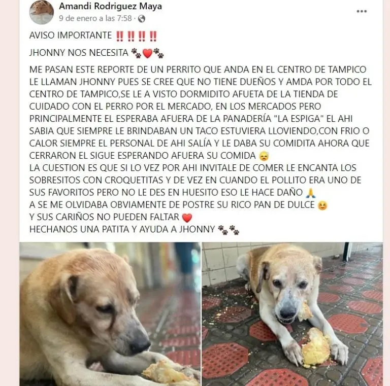 "Jhonny nos necesita... Él esperaba afuera de la panadería 'La espiga', él ahí sabía que siempre le brindaban un taco estuviera lloviendo, con frío o calor siempre el personal de ahí salía y le daba su comidita, ahora que cerraron él sigue esperando afuera su comida", señaló la usuaria.